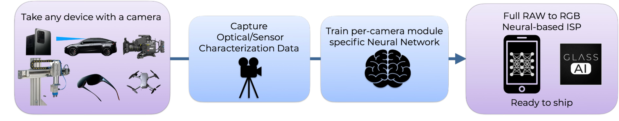 Over the past few years, Glass Imaging has developed a Neural-based ISP, called Glass AI, that could help overcome this issue. As shown in Figure 2, we train a camera-specific neural network to undo the optical aberrations and sensor effects that can run in real-time on edge devices. We have tested our approach against existing state of the art smartphone ISPs and clearly outperformed them (see our comparison on the iPhone 16 + Glass AI vs iPhone 17).