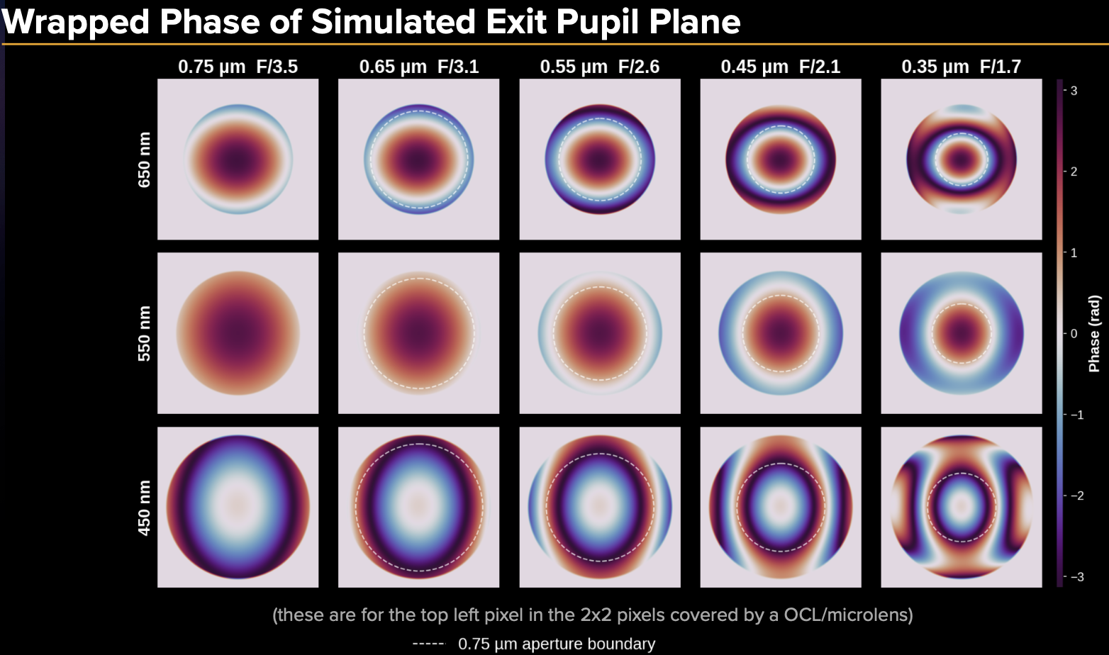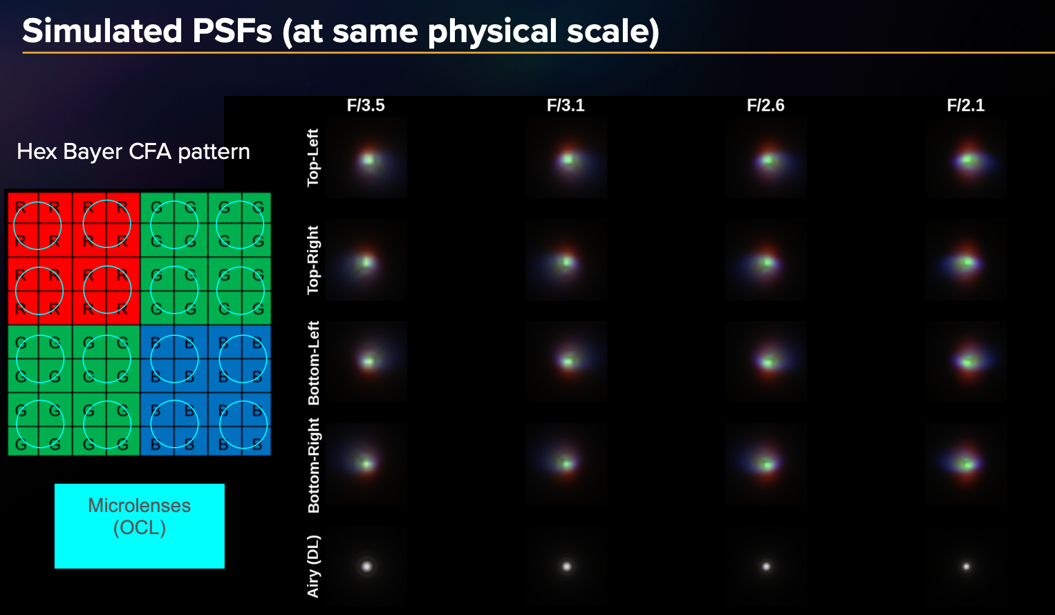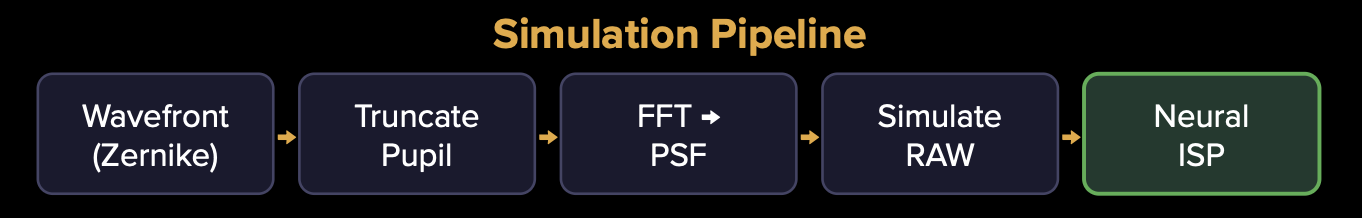The simulation pipeline (shown in Figure 3) begins with modeling the optics and sensor behavior to create realistic RAW images. We start with a representative Zernike wavefront for a typical smartphone lens module. The pupil (i.e. aperture) is truncated based on the selected F/# for that camera configuration. Then we take a Fourier Transform of the pupil function to propagate to the image sensor plane. We also incorporate the sensor's on-chip lens (OCL) effects to achieve the final PSFs shown in Figure 4. We synthesize the final RAW image with Hex Bayer mosaicking (as found on many current 200MP sensors), and model sensor noise. We also account for simulation aspects including SNR normalization. For further experimental details, please see the appendix at the end of this article.