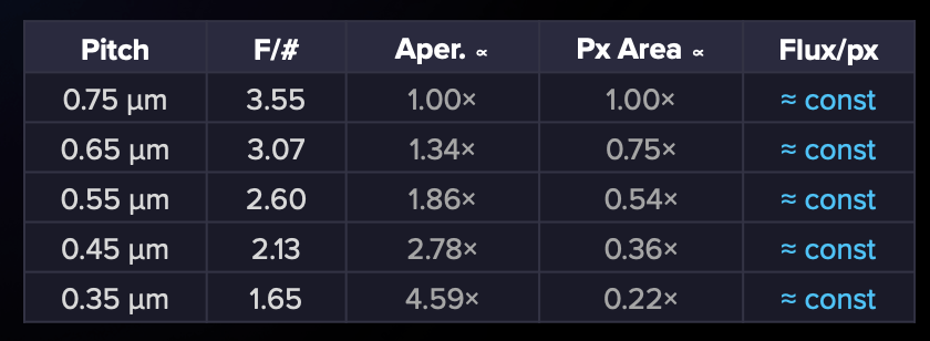 But as pixels shrink, the optics must also keep up. The lens must work harder to create a smaller point spread function, i.e. the image of a single point from the scene. To avoid diffraction blur dominating at smaller pixel sizes, camera designers lower the F-number — opening the aperture wider to keep the diffraction spot small compared to the pixel pitch. This leads to faster lenses (i.e. wider lens with larger aperture that allows for higher light collection and typically faster shutter speeds). The recent Oppo Find X9 Pro (0.5 µm, F/2.1) has a significantly faster lens than the Honor Magic 8 Pro (0.56 µm, F/2.6), and this trend will only accelerate.