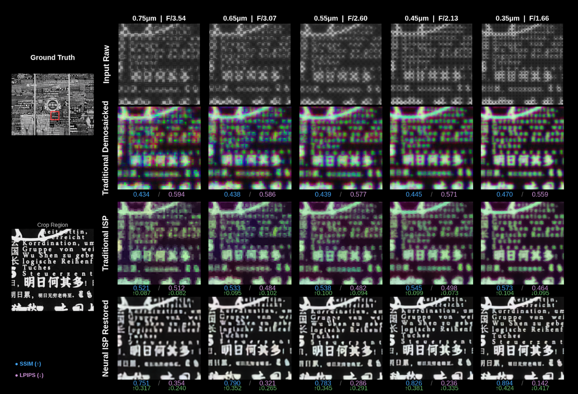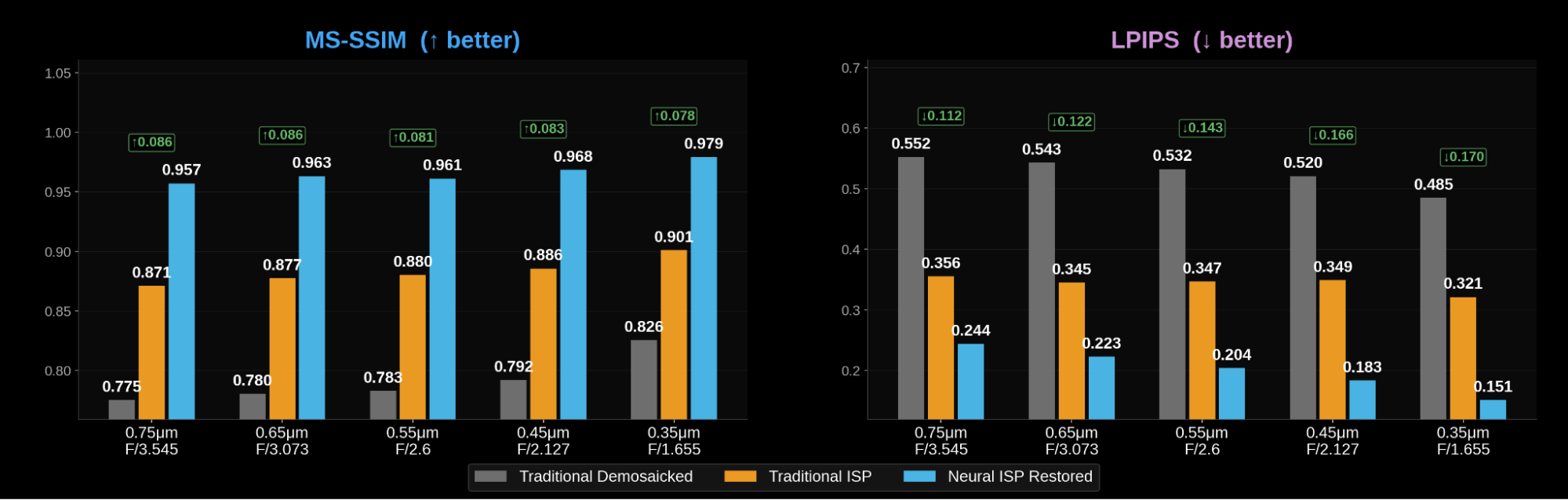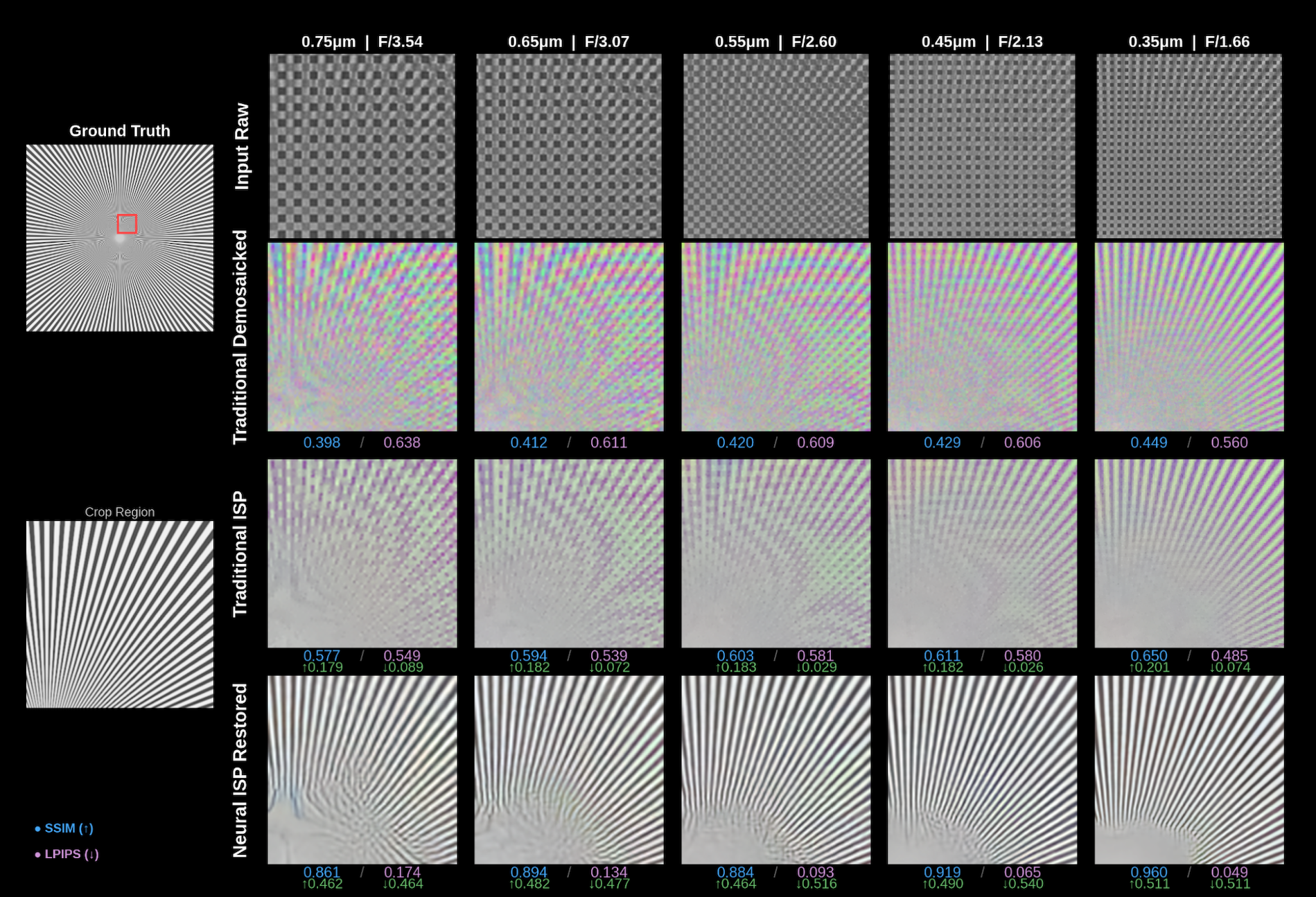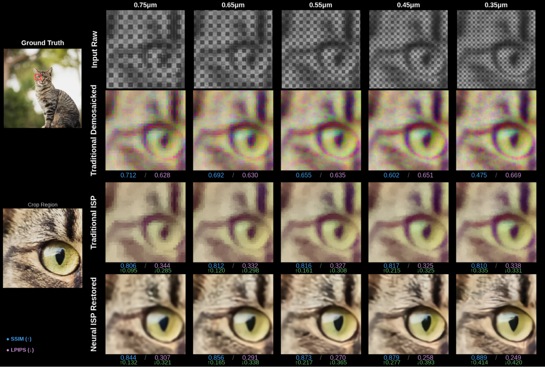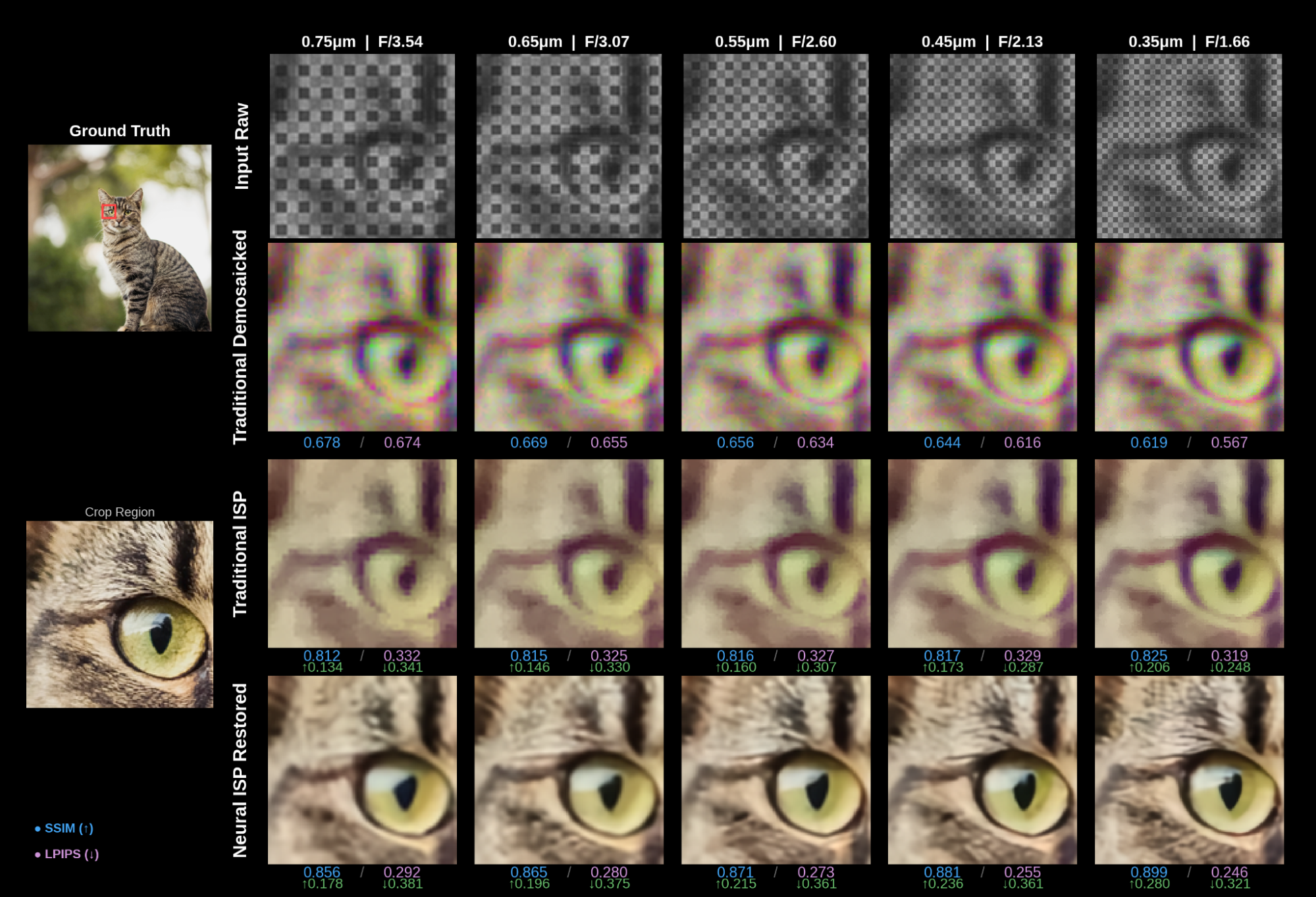 - LPIPS: often regarded as more perceptually accurate than MS-SSIM, the LPIPS score for the Neural ISP improves from 0.244 at 0.75 µm to 0.151 at 0.35 µm, while the traditional ISP shows relatively flat perceptual quality (0.356 to 0.321). The results for traditional ISP outputs reflected the perceived observations from the natural image analysis: the increased sampling density was offset by a larger effective PSF, leading to persistent blurriness even at reduced sensor pixel sizes.