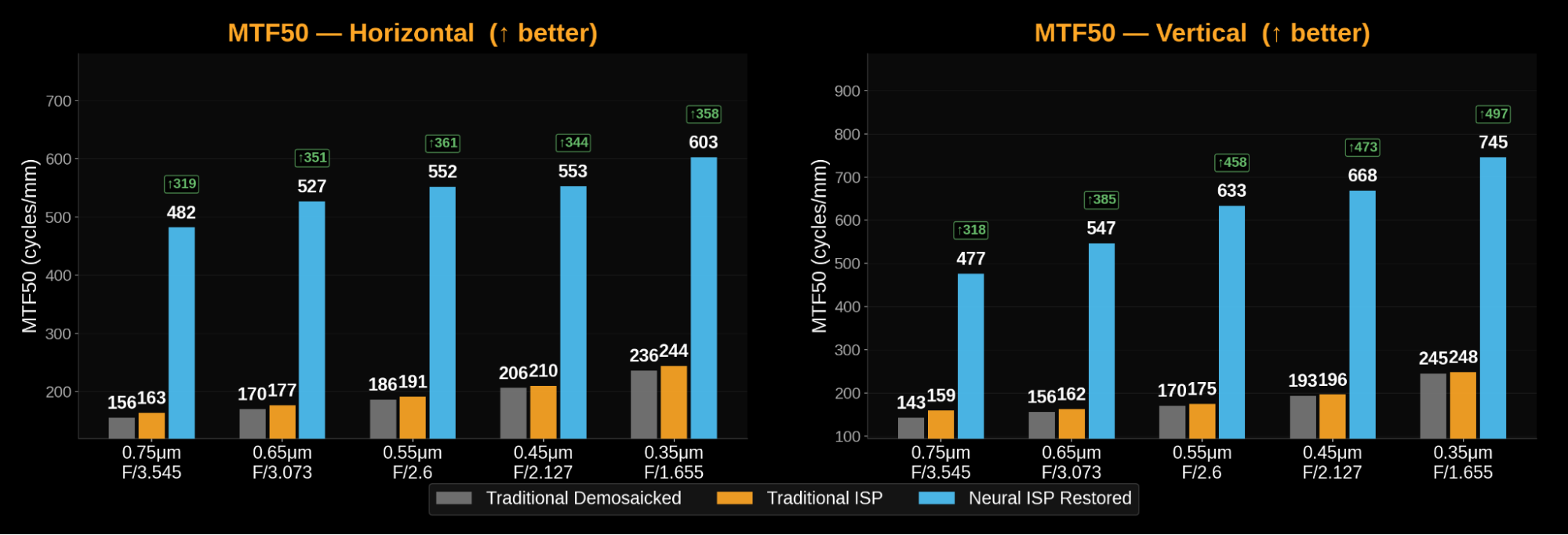 MTF50 improves with both methods due to smaller pixels (because there are more pixels per mm), but the Neural ISP improves far more dramatically. The traditional ISP gains about 50% from 0.75 to 0.35 µm; the Neural ISP gains about 25% — but from a much higher baseline, resulting in an absolute MTF50 that reaches 745 cycles/mm in the vertical direction at 0.35 µm.