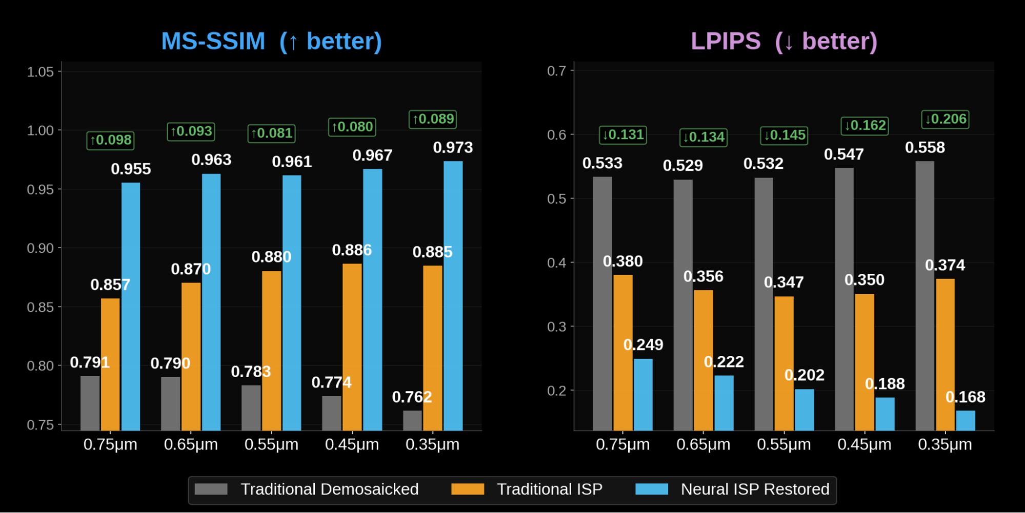 - MS-SSIM: the Neural ISP scores are very high across the board (0.957 to 0.979), and the absolute delta appears to decrease slightly at the smallest pitches. This is a known ceiling effect: MS-SSIM compresses gains as scores approach 1.0, making each incremental improvement harder to register. The traditional ISP does improve from 0.871 to 0.901, reflecting the higher sampling density.